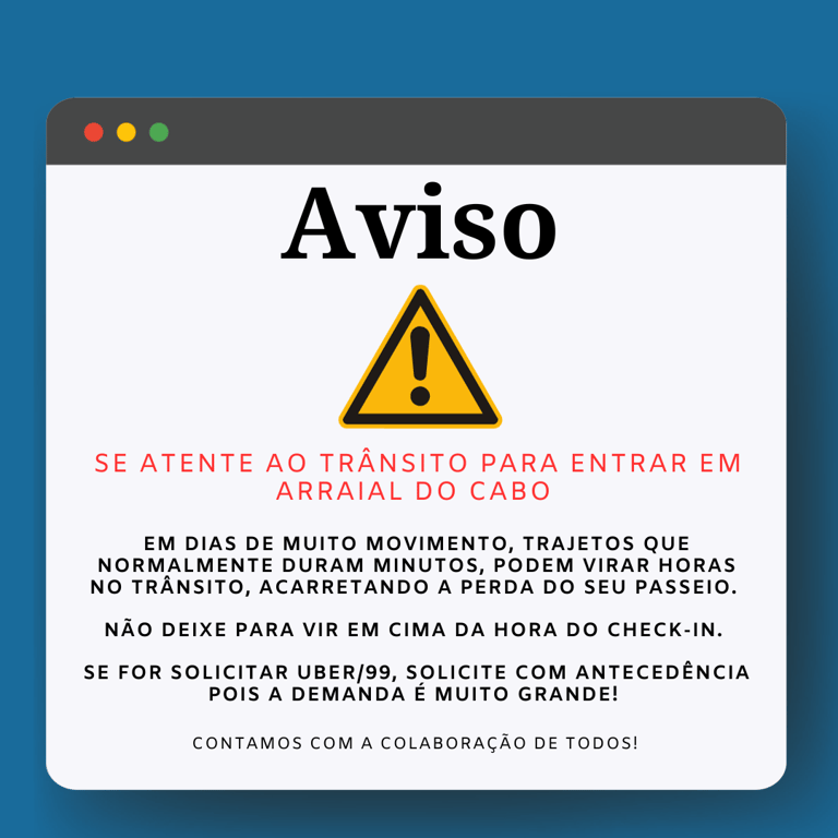 Poderá haver atraso no horário de embarque e desembarque, conforme ordem de embarcações definidas para realizar atracagem no Píer da Praia dos Anjos, bem como ordem de atracagem para embarque e desembarque nas demais praias do roteiro – motivos estes alheios à embarcação;