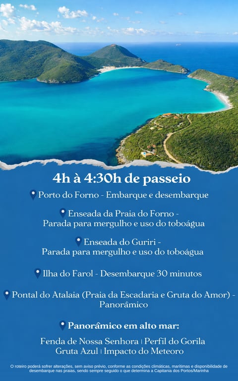 (O roteiro poderá sofrer alterações, sem aviso prévio, conforme as condições climáticas, marítimas e disponibilidade de desembarque nas praias, sendo sempre seguido o que determina a Capitania dos Portos/Marinha)